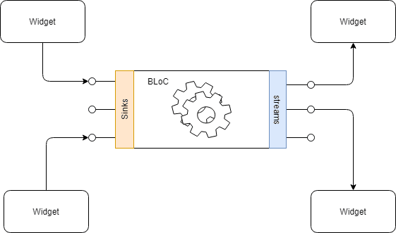 위젯은 Sinks (입구)를 통하여 BLoC에 이벤트를 보냄 BLoC 객체는 위젯으로부터 이벤트를 전달받으면 필요한 Repository 등으로부터 데이터를 전달받아 Business Logic을 처리함 Business Logic 을 처리한 후, BLoC 객체를 구독 중인 UI 객체들에게 상태를 전달합니다.