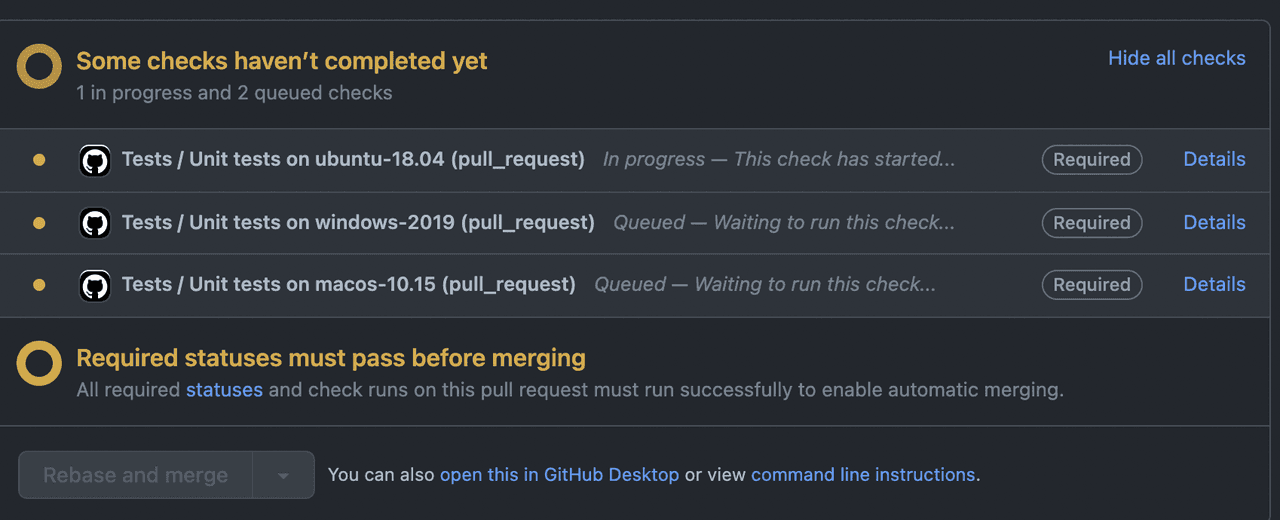 요청한 Pull Request를 보면 아래와 같이 테스트를 자동으로 진행합니다.
