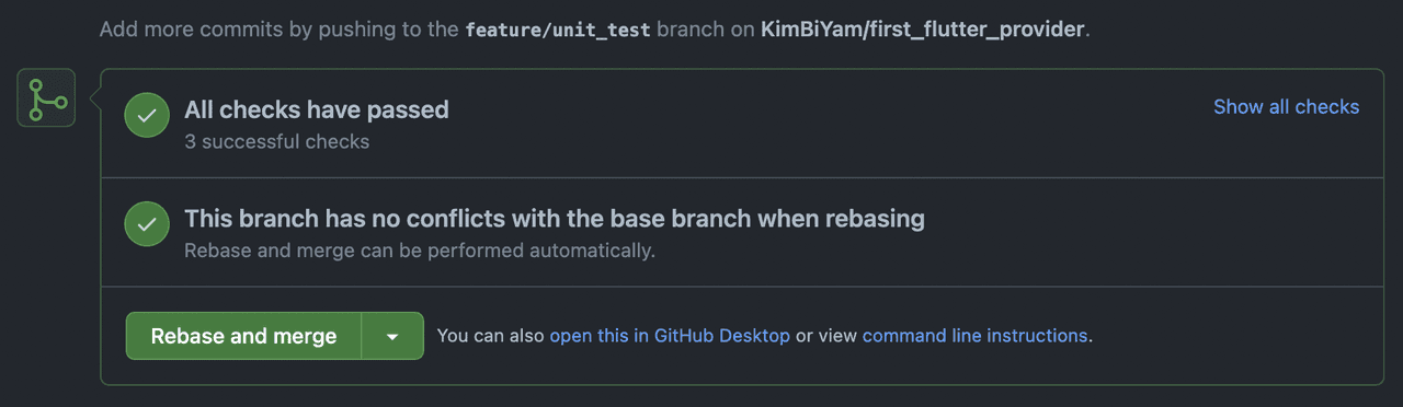 그 후 모든 테스트가 성공적으로 완료되면 Merge 버튼이 활성화 되어 Merge가 가능합니다.