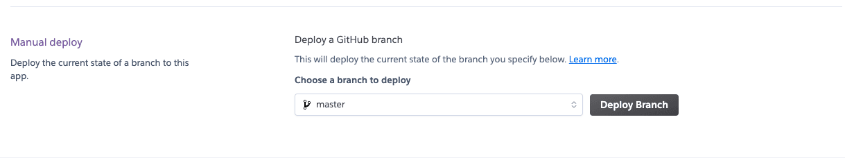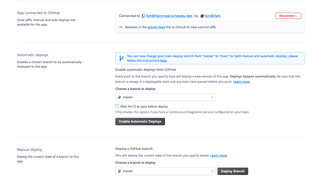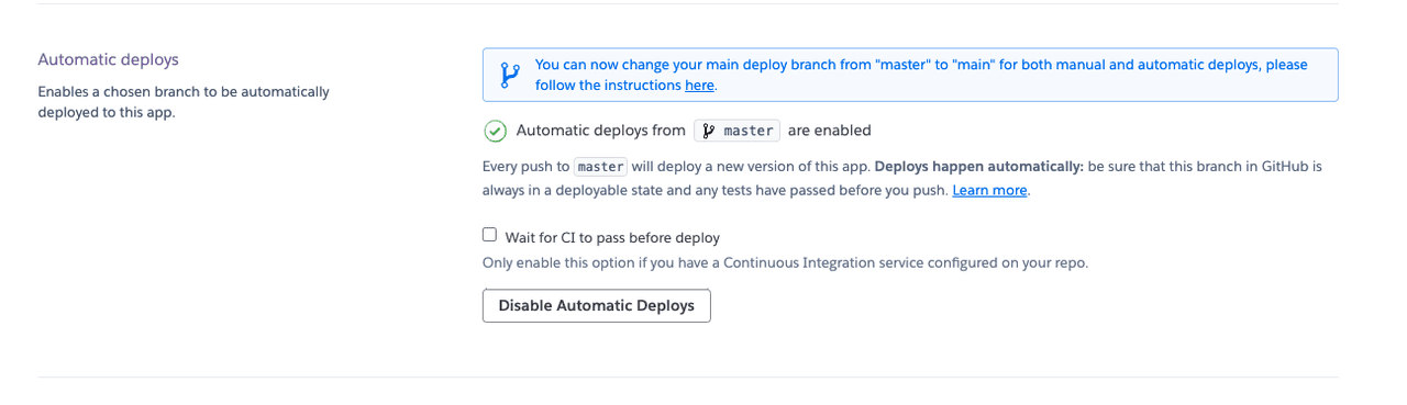 Choose a branch to deploy 항목에서 원하는 브랜치를 설정 후 Enable Automatic Deploys 버튼을 클릭하면 활성화가 됩니다