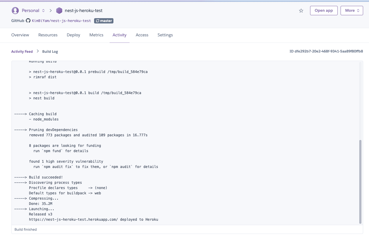제일 하단에 https://nest-js-heroku-test.herokuapp.com/ deployed to Heroku 라는 문구와 함께