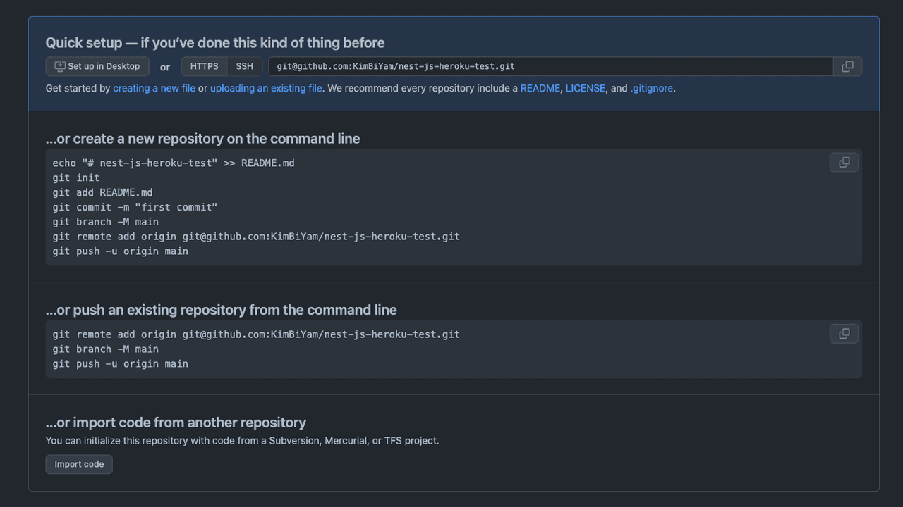 레포지토리 생성 후 나오는 가이드를 참고하여 코드를 푸시합니다