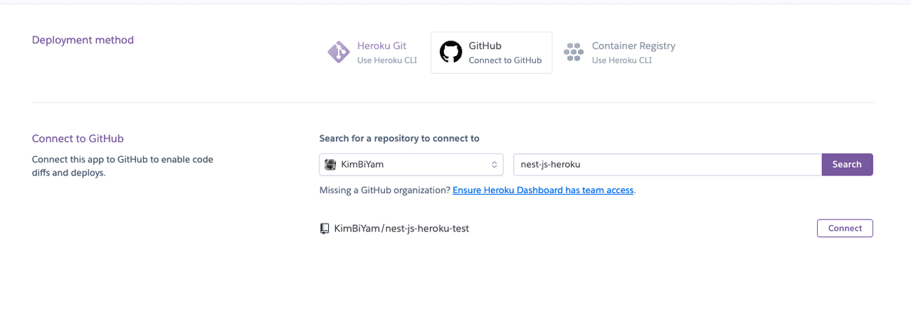 그 후 heroku 프로젝트에서 해당 레포지토리를 연결합니다